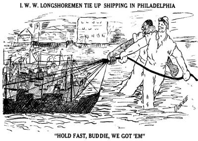 May 27, 1916: 3000 members of the Marine Transport Workers of the IWW marched along the Philadelphia waterfront, leading to strikes at three non-union docks. Black and white Wobblies fought together against scabs and police.